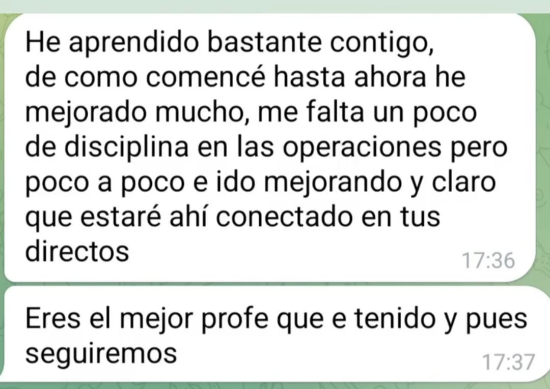Asimismo, no se anima ni se invita de ningún modo a “copiar” directamente las operaciones o estrategias financieras; las decisiones son responsabilidad exclusiva del usuario. El acceso a posibles grupos o plataformas mencionadas debe entenderse como parte de una experiencia educativa, libre y voluntaria, sin fines de inversión colectiva ni gestión de ahorro.